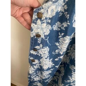 Vintage-inspired sleeveless jumper dress crafted from breathable 100% cotton denim with a charming all-over white floral print on a blue wash. This midi-length piece features a classic scoop neckline and functional side buttons with branded metallic hardware for an adjustable fit or easy layering. Perfect for a cottagecore or casual aesthetic, it offers a relaxed silhouette that pairs well with tees or blouses.