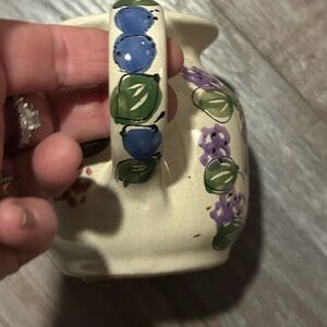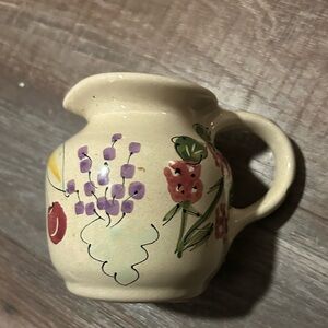 Questions? Leave a comment below! Mesa International stoneware creamer handcrafted in Hungary, featuring a hand-painted "Mixed Berry Floral" pattern.