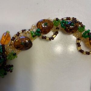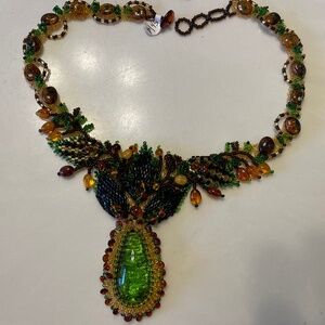 • Materials: The necklace appears to be made with a variety of materials, including seed beads, larger round beads of NATURAL YELLOW AND BROWN AMBER, and a substantial, oval-shaped green central element. The smaller, multi-colored beads create a detailed, leaf-like motif around the central piece.