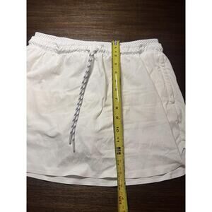 Design: Short athletic skort with solid white textured fabric, curved hem, and built-in shorts for coverage and comfort