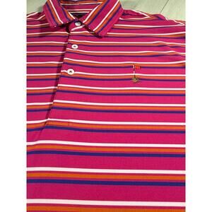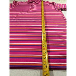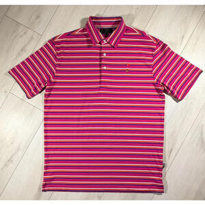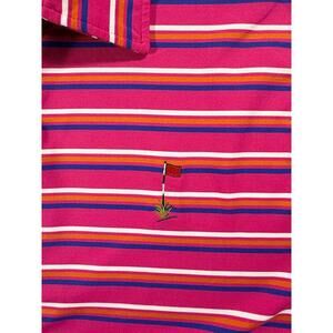 The striped pattern and logo accents add a touch of golf-themed flair to the classic polo style.