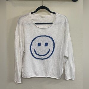 Casual white sweater featuring a blue smiley face design. Made by Promesa, this piece is perfect for a relaxed, playful look. Ideal for layering. Worn once, in new condition.