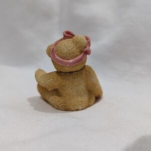 Adorable vintage teddy bear figurine designed by Priscilla Hillman and licensed by Enesco. Features a sweet seated teddy with a pink bow and faceted heart necklace. A classic 1990s collectible giftware piece.