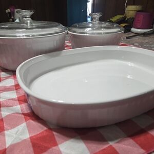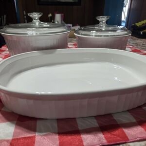 A 3-piece set of white CorningWare French White casserole dishes with glass lids