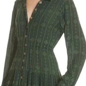 Free People Diamond Head Embroidered Midi Dress, Raw Linen, Dark Green with Button Front.