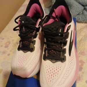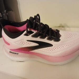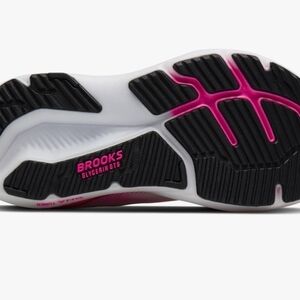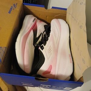 Sleek Brooks athletic shoes for women. Stylish white and pink design. Perfect for running and workouts.