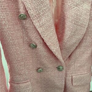 Stylish Zara blazer in blush pink tweed. Features elegant silver buttons. Perfect for a sophisticated look.