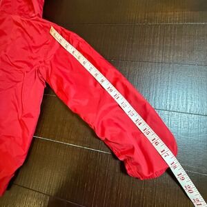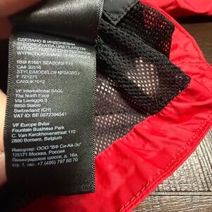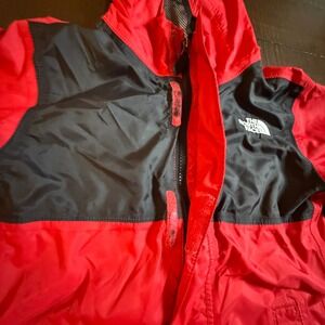 The North Face DryVent rain jacket in a vibrant red and black colorblock design. This lightweight shell features a breathable mesh lining, a full-zip front with a hook-and-loop storm flap, and a fixed hood for weather protection. Designed with elastic cuffs and secure-zip hand pockets, it offers reliable performance for outdoor adventures. Note that there are some minor dark marks on the sleeve and body as shown in the photos.