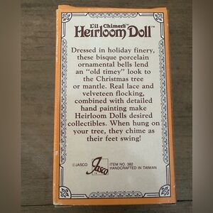 This is a L’il Chimers Heirloom Doll handcrafted porcelain bell Christmas tree ornament. This ornament was made by Jasco during the 70’s or 80’s; it is in excellent condition, & is in its original box.