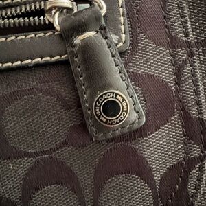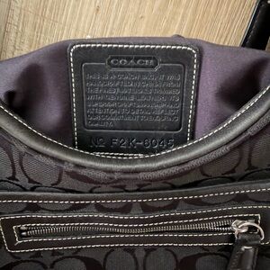 Chic black hobo bag by Coach. Features signature pattern. Ideal for everyday use.