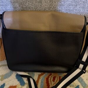 Elegant Coach messenger bag with a two-tone design. Features a tan body and black accents. Ideal for everyday use.