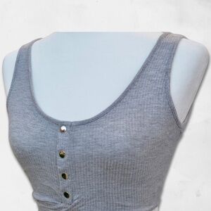 Windsor ribbed knit crop tank in heather gray with a button front detail and wrap tie waist. Fitted stretchy fabric with a scoop neckline.