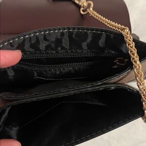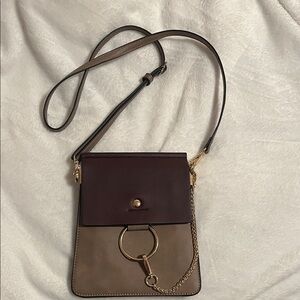Stylish crossbody bag with a brown and tan design. Features gold chain detail. Perfect for versatile wear.