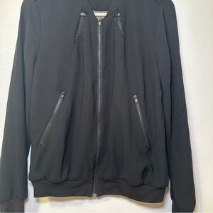 Chic black bomber-style jacket with a clean, modern silhouette. Features a full zip-front closure, zippered front pockets, and subtle mesh panel accents near the neckline for a sporty-edgy touch. Lightweight with a smooth drape and ribbed trim at the hem and cuffs for a flattering fit. Perfect for layering over casual or dressed-up looks.