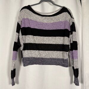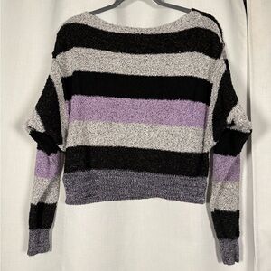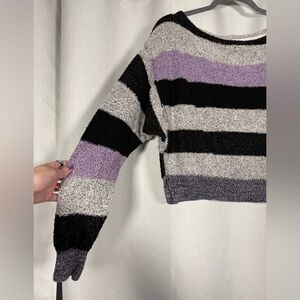 Free People Black Grey Purple Candyland Striped Crop Knit Sweater. Cropped length, relaxed fit. Bat wing sleeves. Marled knit. Grey, black, and purple horizontal stripes. Size Small.