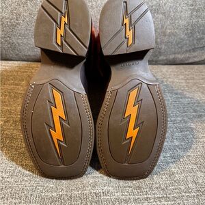 Bold orange shaft with intricate stitching. Deep brown leather foot. Classic western style.