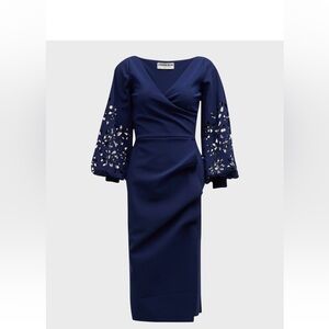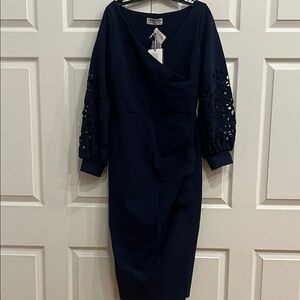 This elegant navy blue Chiara Boni dress features intricate lace sleeves, perfect for any occasion. The sophisticated design offers a flattering fit and timeless style.