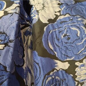 Adrianna Papell Blue Floral Cocktail Dress with back zipper, two side POCKETS! Front bodice embellished with beads and blue stones, v neckline, fully lined, brocade pattern