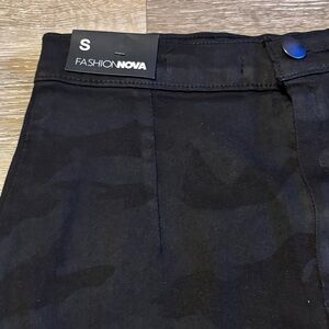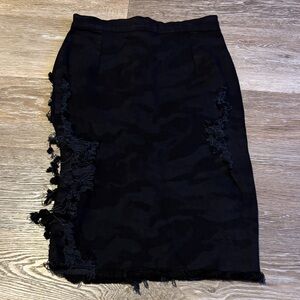Sleek black pencil skirt with frayed detailing. Perfect for a bold, modern look. Black with camo detail.