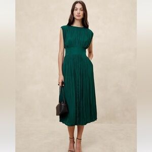 The Crystal Pleated Maxi Dress is crafted from polyester that has been specially treated to create a pleated textured aesthetic, adding a unique and stylish element to the garment.