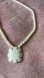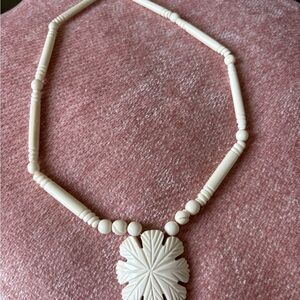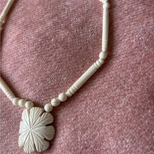 Unique white beaded necklace with flower shaped pendant. Measures 21” in length.