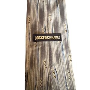 Classic Dockers Khakis men's tie made of 100% silk, featuring a gray and blue abstract wave design with small geometric accents. Approximately 59" long and 3.75" wide. Soft, smooth silk with a subtle sheen. Appears in good pre-owned condition with no major flaws noted.