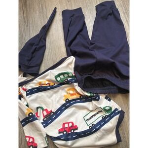 Baby boys and girls transportation themed outfit set. Includes a long-sleeve bodysuit with an allover print of cars, buses, trucks, and roads. Also features a pair of navy blue pull-on pants with a drawstring and a coordinating navy blue hat. Snaps at the bottom of the bodysuit for easy diaper