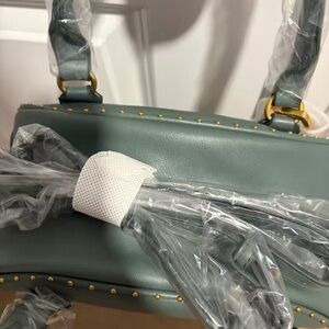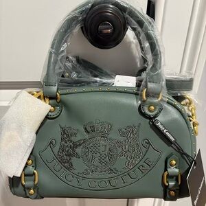 Elegant Juicy Couture satchel in sage green. Features embossed logo and gold accents. Perfect for stylish outings.