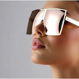 Keywords: oversized sunglasses, shield sunglasses, flat top sunglasses, mirrored sunglasses, gold frame sunglasses, fashion sunglasses, women's sunglasses, statement sunglasses, rimless sunglasses, large sunglasses, trendy sunglasses, designer inspired