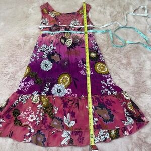 Rare 03-08 Y2K Forbiddden for Anthropologie babydoll dress in a vibrant magenta floral print. Features a heavily embellished crochet bust with metallic studs, adjustable tie waist, and a floaty tiered hem.