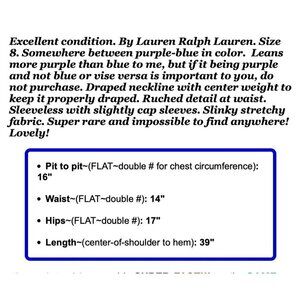Excellent condition. By Lauren Ralph Lauren. Size 8. Somewhere between purple-blue in color. Leans more purple than blue to me, but if it being purple and not blue or vise versa is important to you, do not purchase. Draped neckline with center weight to keep it properly draped. Ruched detail at waist. Sleeveless with slightly cap sleeves. Slinky stretchy fabric. Super rare and impossible to find anywhere! Lovely!