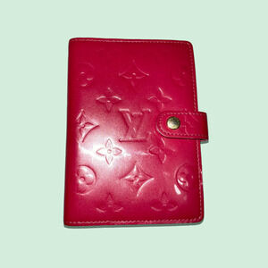 Pink Monogram patent leather Louis Vuitton vintage Vernis small ring agenda cover with gold-tone metal hardware, dual slip pockets at interior walls, 3 card slots, pen loop at side, snap closure at front and brand stamp at interior