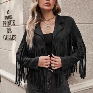 Stylish black fringe jacket perfect for adding a touch of flair to any outfit. Ideal for casual or evening wear.