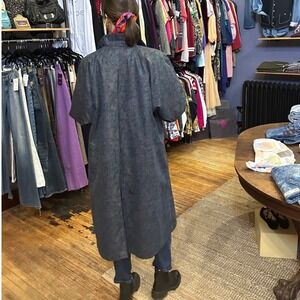 Relaxed fit that works beautifully oversized on a modern medium. Structured collar, button front, deep pockets, and dramatic 44" length for that effortless city trench vibe. The subtle blue, charcoal, and muted plum floral gives it quiet statement energy without overpowering your look.