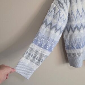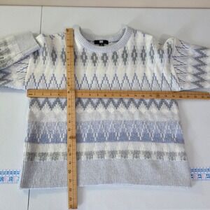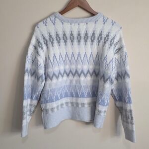 Soft knit crewneck sweater features a classic Fair Isle inspired geometric pattern in a soothing palette of light blue, white, and grey. Designed with a relaxed drop-shoulder silhouette and ribbed trim at the neckline, cuffs, and hem, this cozy piece offers a comfortable stretch fit. The intricate jacquard-style knit provides a textured look perfect for seasonal layering.