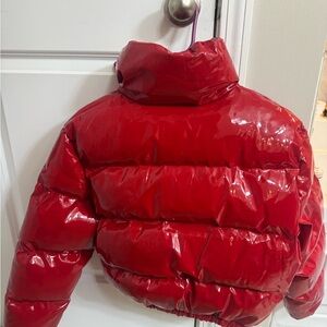 Vibrant cherry red puffer jacket. Glossy finish with front zipper. Elastic hem for snug fit.