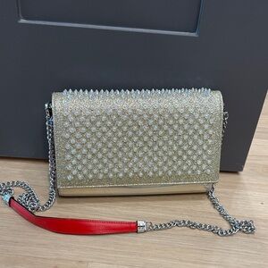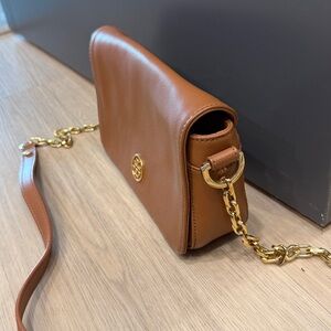 Chic Tory Burch crossbody in tan leather. Features elegant gold chain strap. Perfect for versatile styling.
