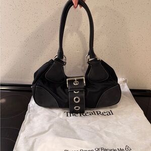 Sleek Prada shoulder bag in black. Features silver hardware and stylish buckle detail. Perfect for any occasion. Bought from therealreal, only dust bag in the photo is provided. Smoke free, pet free home