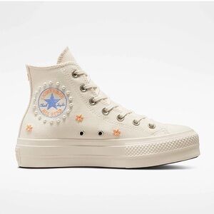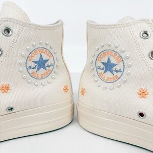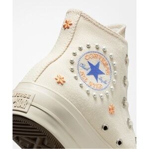 Elevate your style with these stunning new Converse Chuck Taylor All Star platform high sneakers. The iconic low-top design is updated with a fashion-forward twist, featuring pearls that adds a touch of glamour to any outfit.
