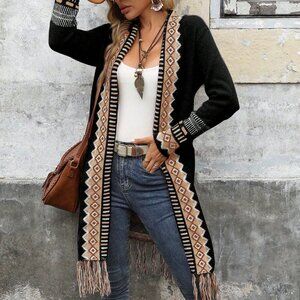 A black casual geometric long cardigan offers a relaxed silhouette with a shawl collar and regular‑fit construction. Long sleeves and fringe detailing add texture, while the thigh‑length cut provides extra coverage for late‑fall weather. The regular hem and classic shape make it easy to layer over tops or dresses for effortless style.