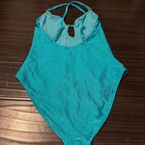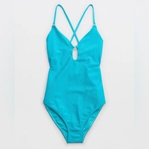 AE Aerie Cheeky Blue Strappy V Neck Plunge One Piece Swimsuit Size Large