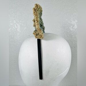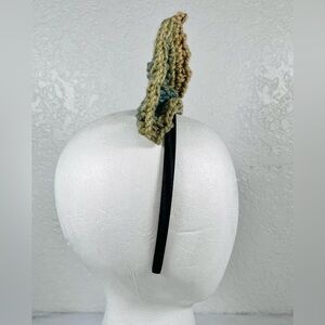 Charming hand crafted crochet bow headband with a unique design. Features a blend of tan and green.