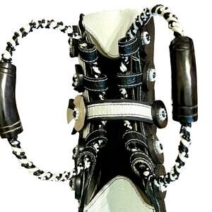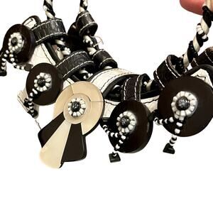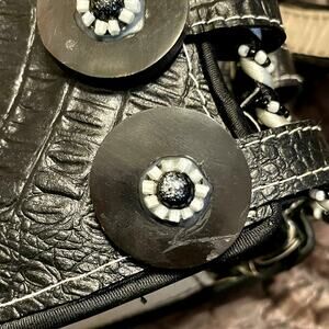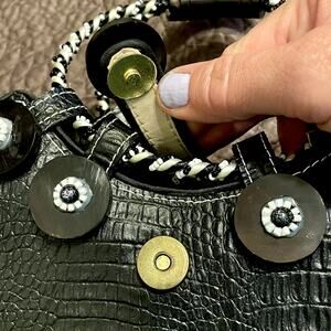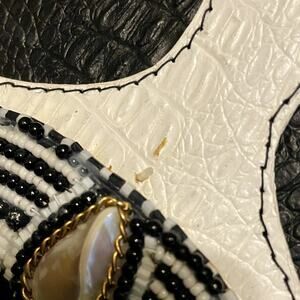 Oh my goodness I must be crazy to sell this adorable bag by Mary Frances! It truly is darling! It's a retro black & white frame bag with buttons, beads and mother-of-pearl decoration. It's in great preloved condition overall with just a couple of very minor flaws - there's a small spot on the front and some idiot (not me, lol) ran a black marker over the label on the inside - see photos, please.