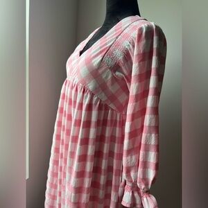 Stylish dress with pink and white checkered pattern. Features a V-neck and long sleeves. Ideal for casual wear.