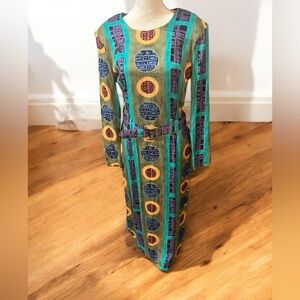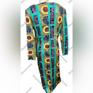 This L. Fox women's dress is a colorful addition to your wardrobe. The dress features a circular pattern in blue, green, yellow, and purple. The long sleeve sheath dress has a round neckline and a zip closure. It's made of woven rayon and is perfect for travel, parties, casual outings, and business meetings.