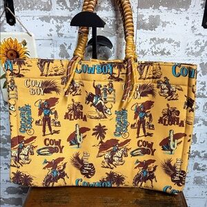 Vibrant tote with cowboy design. Features Wrangler logo. Ideal for everyday use.