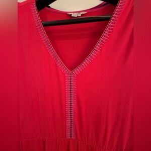 Boden Coral Pink Embroidered V-Neck Dress 16R in soft, comfortable jersey with ruching at the shoulders . Great condition no rips, tears or stains. Pre-loved.