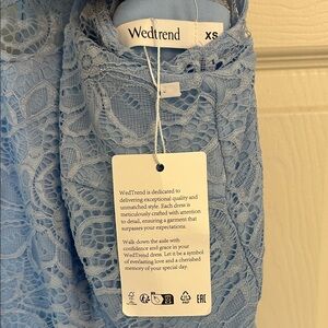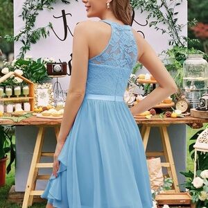 This elegant blue lace dress is perfect for special occasions. The delicate lace overlay on the torso adds a touch of sophistication, making it a must-have for your wardrobe. Zipper closure in back.