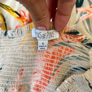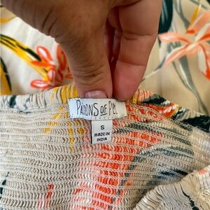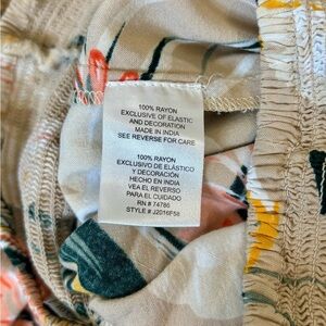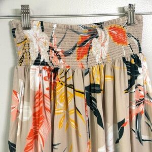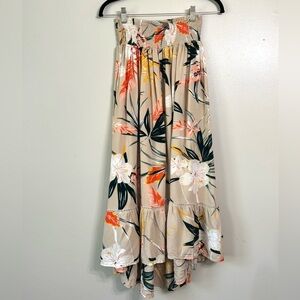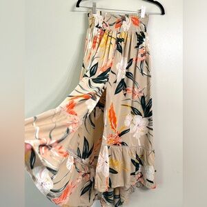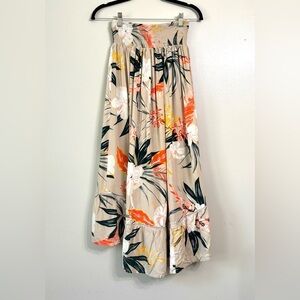 Patrons Of Peace Tropical Skirt. Front center slit. Flowy with shorter front and longer back. Colorful leaf design on tan background with smocked elastic waist. Excellent condition.