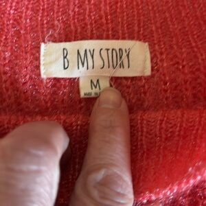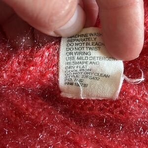 This is a fun sweater! It is 100% polyester. Has a soft, fuzzy, bouncy feel to it. It is a coral pink color, looks slightly darker in the photos than in person.